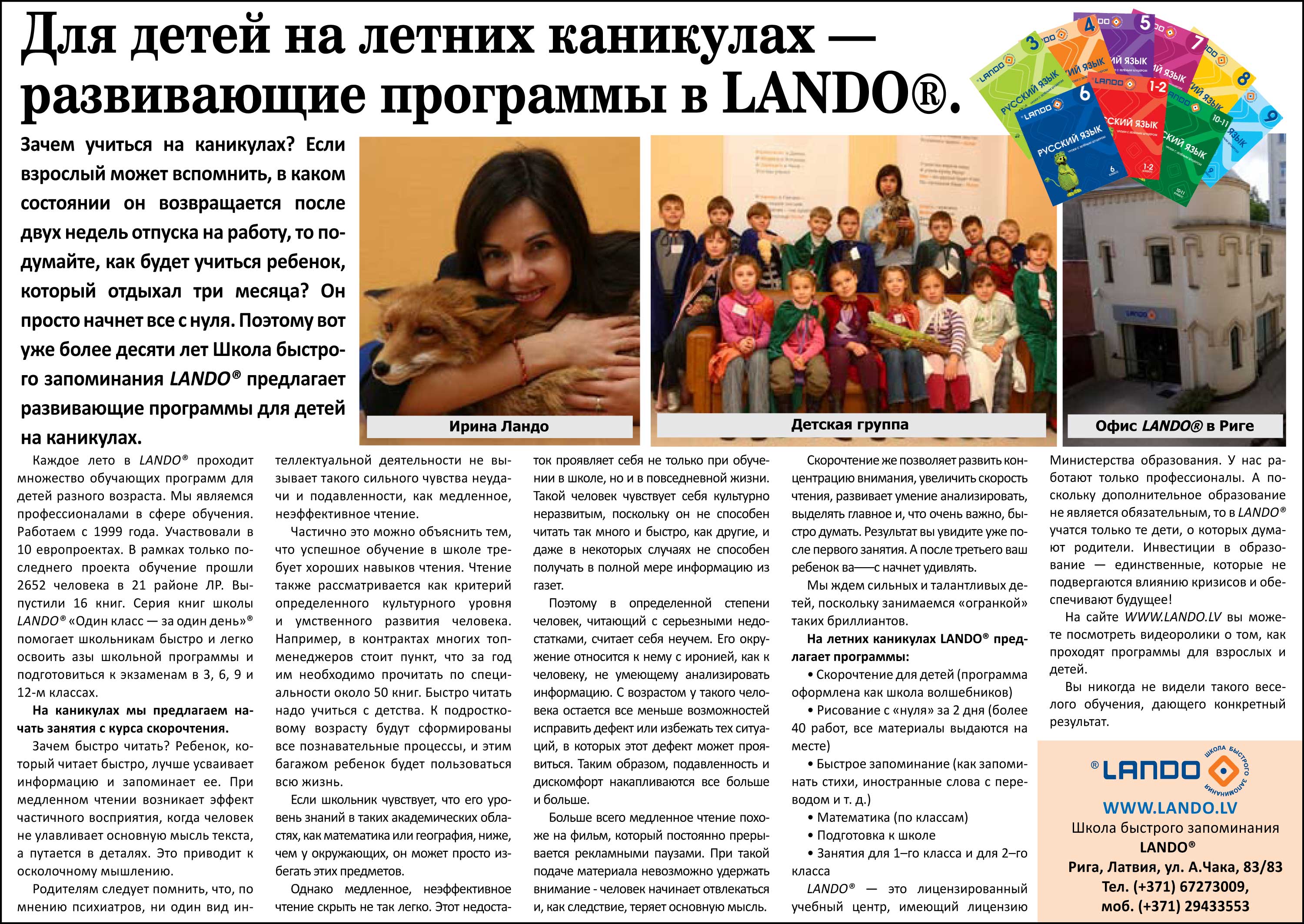 Каждое лето в школе быстрого запоминания LANDO® проходит множество обучающих программ для детей разного возраста. Мы являемся профессионалами в сфере обучения. Работаем с 1999 года. Участвовали в 10 европроектах. В рамках только последнего проекта обучение прошли 2652 человека в 21 районе ЛР. Выпустили 16 книг. Серия книг школы LANDO® - "Один класс - за один день"® помогает школьникам быстро и легко освоить азы школьной программы и подготовиться к экзаменам в 3, 6, 9 и 12 классах.